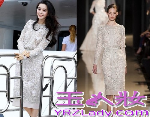 范冰冰身穿Elie Saab 2013春夏高定系列出席电影《绝地逃亡》见面会,一身白色套裙,贯设优雅古典的作风,满身珠钉和花朵装饰的礼服非常奢华精致。