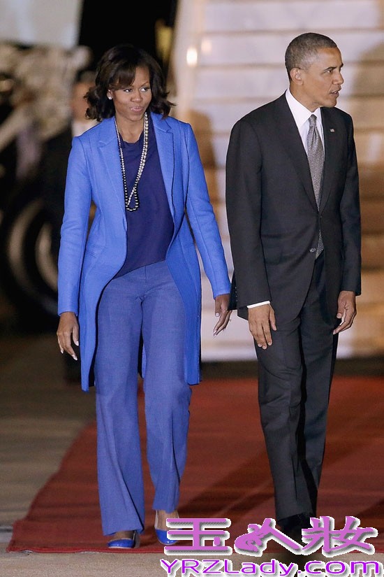 米歇尔·奥巴马一套蓝色制服出席活动,为了打破纯色的单调,她巧用一串珍珠项链作为点辍。