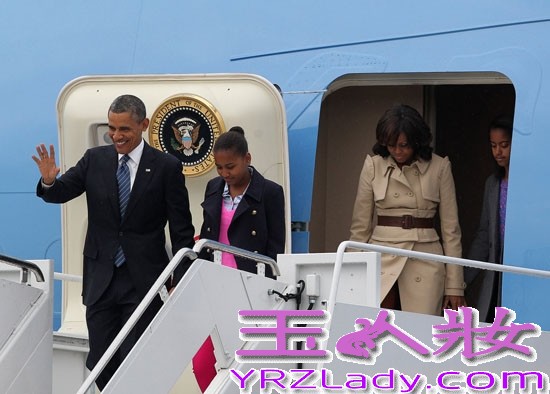 总统一家降落在贝尔法斯特,第一夫人一件黄油巴宝莉风衣亮身。