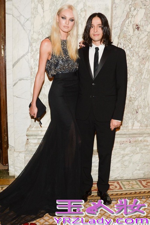 性感撩人的坎蒂丝斯瓦内普尔(Candice Swanepoel),一袭黑色长裙如黑天鹅般高贵,身边的设计师是奥利维尔泰斯金斯(Olivier Theyskens)