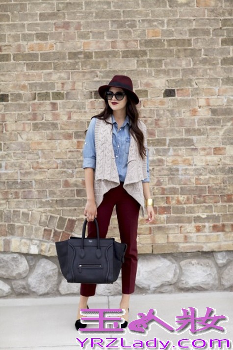 酒红色的混搭,大气优雅,让人印象深刻,深层的酒红色,经过岁月洗礼,多了份沉稳执着,着于身也能彰显出女性的成熟魅力,端庄出众的气质,混搭配牛仔衬衫和针织无袖开衫、黑色高跟鞋,舒适休闲中透出的惬意感,已足够吸住眼球。
