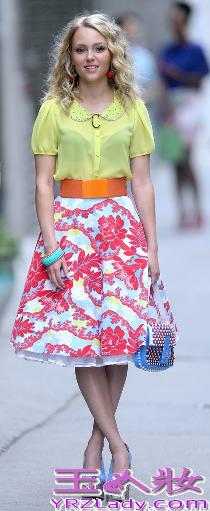 黄色彼得潘领上衣搭配流行印花半身裙,夏季可爱甜美风格。