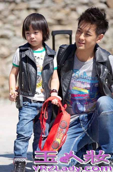 录节目时的休闲亲子装,KIMI的迷你装和林爸爸的成年版休闲装,两人在一起和谐又有范儿哦。黑色马夹和卡通图案的T恤衫、宽松的牛仔裤,小KIMI从小就知道耍酷,林爸爸心情愉悦的蹲在身边,和乐融融的样子很有爱哦。