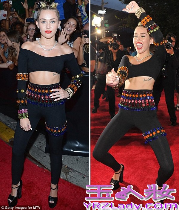 麦莉·赛勒斯(Miley Cyrus)身穿一套露肩和中空黑色紧身衣亮相2013MTV音乐录影带大奖,俏皮可爱