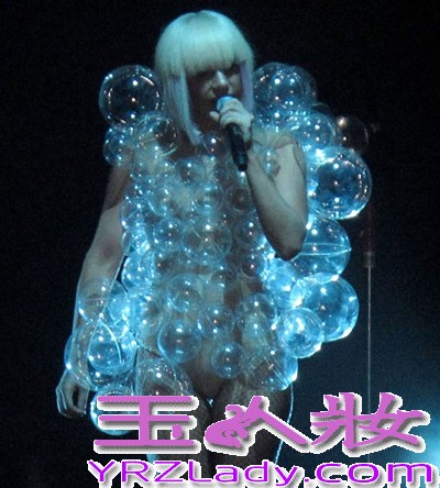 全身被透明圆球包围的gaga,这时候也透漏着一股空灵感,在她少量体现温暖一面的着装中,这一款让人赏心悦目,也缓冲了视觉上的刺激感。