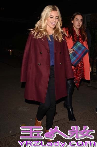 歌手茉莉·金(Mollie King)栗色风衣披在身上,里面一件很显气质的深蓝色打底衫搭配黑色紧身裤,脚上则是选择一双棕色时尚短靴,是不是很显明星大牌范呢?