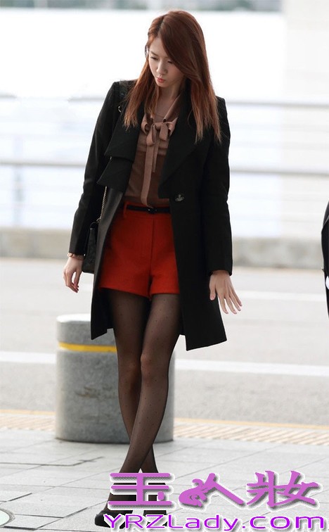 少女时代允儿这套搭配展现了十足的女人味,金棕色的蝴蝶结衬衣搭配高腰红色短裤,外搭黑色的风衣,名媛味十足,加上一双超高黑色高跟鞋,简单又时尚。
