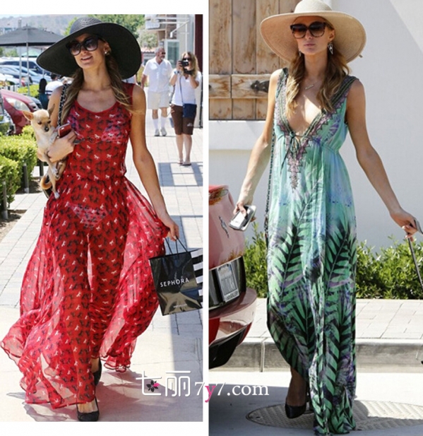帕丽斯·希尔顿的着装一直都很受瞩目,这位It Girl每一次出街的穿着打扮都非常的完美,这两款不同风格的长裙穿出了不同的气质,深V的高腰款式连衣长裙搭配草编帽很时尚性感,红色的印花透视长裙非常的飘逸性感,这两款长裙都很适合度假。