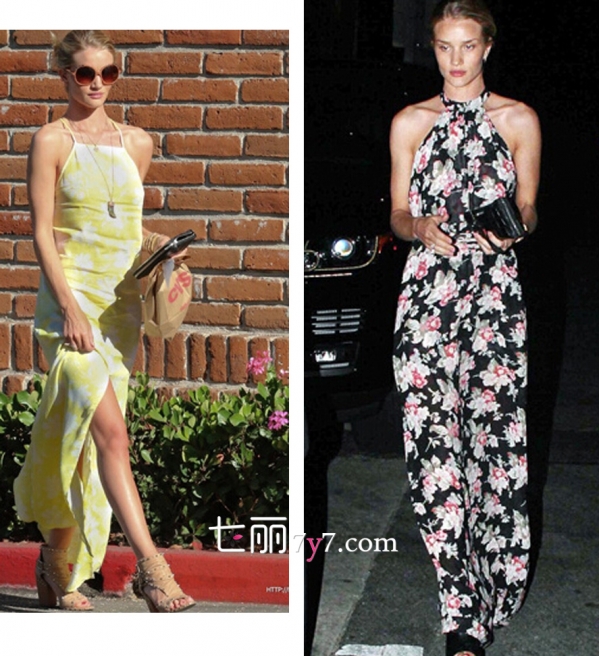 罗西这条黑色的印花长裙,挂脖的设计突出完美的锁骨与肩膀,不穿内衣的罗西看起来也是平胸,黄色长裙高开叉的款式尽显修长美腿,吊带的款式很性感。