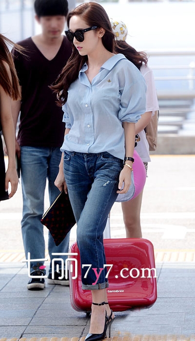 Jessica郑秀妍:浅蓝色衬衫+牛仔裤