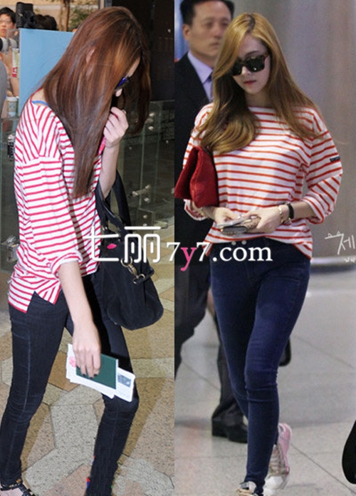 搭配要点:两姐妹身穿同样的红白条纹T恤,但是演绎出不一样的Feel,郑秀晶选择了黑色的平底凉鞋,郑秀妍选择了粉色的帆布鞋,下面大欧式搭配紧身牛仔长裤,把姣好的曲线显示出来,搭配都很不错。