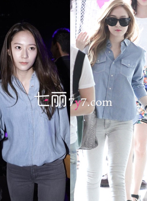 搭配要点:同样是牛仔衬衫的搭配,两姐妹都有不同的Feel,郑秀晶将衬衣扎进牛仔裤里,这样更显腰身,郑秀妍的牛仔衬衣数以短款,没有扎进去,非常轻松休闲,两人的搭配都非常显腿长。