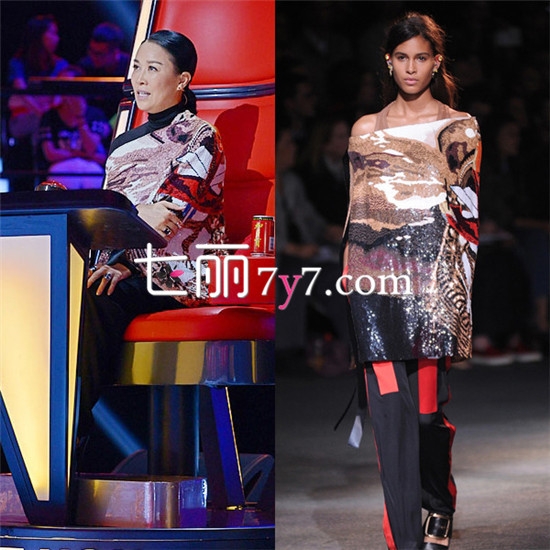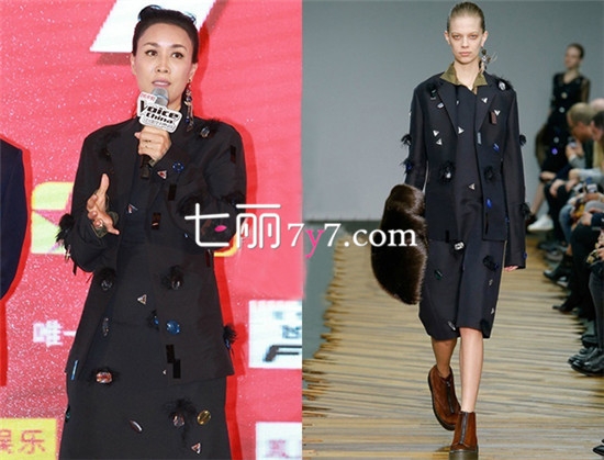 时尚点评:那英穿着这套Celine套装参加中国好声音第三季的发布会,Celine的套装很适合那英的气质,虽然是黑色调,但是那英的出现还是亮瞎了小伙伴的双眼。黑色的西装在镶钻的点缀之下,不会显得小家子气,配色、剪裁都是无可挑剔的。