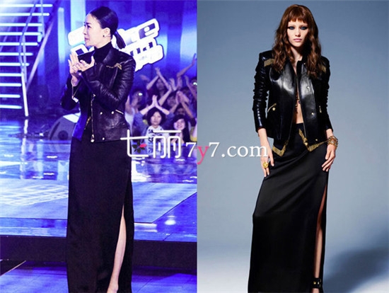 时尚点评:中国好声音第三季那英的服装自然是可圈可点的,回顾往期的比赛,发现那英的搭配也有很多值得学习的地方。这件Versace 2013早秋系列看上去非常酷,立体剪裁皮衣+开叉长裙,即便没有搭配过硬的配饰,也能展现出强大气势。