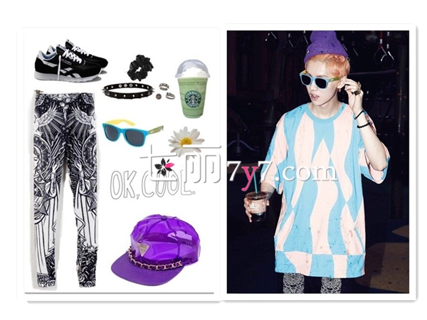 搭配要点:蓝色的蝙蝠袖上衣,上面印有罗粉色的不规则的图案,中长款的设计有点中性的Feel,搭配图腾的元素的裤子,潮范十足!可见鹿晗的时尚指数之高,简单的服装也能穿出不一样的Feel。