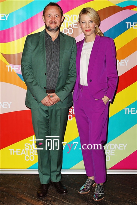 澳大利亚影视演员凯特·布兰切特与丈夫参加悉尼剧院公司开幕式,身穿明亮的紫色西服套装,内搭白色打底衫,脚踩牛津皮鞋,帅气又养眼!