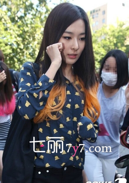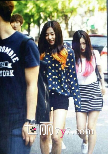 橘黄色的涩琪,在近期上班打歌照的服装中,则显得比较欧美范一些,这件深蓝色身衬衫,搭配上黑色短裤,特别是有橘黄色头发的衬托下,让整体的造型暗色调中和许多,背上黑色包,超显时尚Feel。