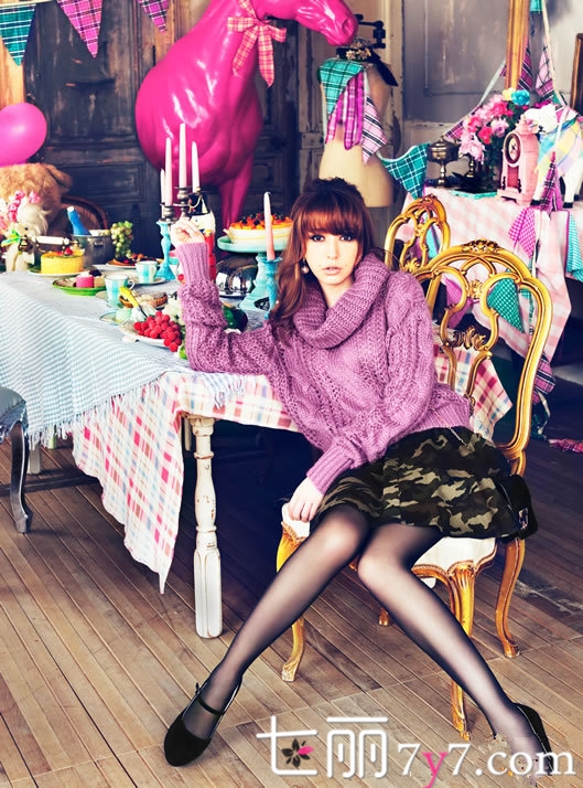 搭配要点:Lena拥有令人羡慕的身材,是许多人心目中的女神。她身穿紫色的毛衣,高领的设计保暖又可以凹造型,搭配迷彩的高腰裙韵味十足,两种不同风格的冲撞,也有不一样的Feel。