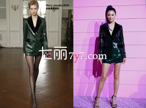 搭配要点:张雨绮身穿2014年秋冬新款绿色亮片套装,大胆真空上阵,露出修长美腿,这套造型性感又火辣。冲天炮的马尾加入淡紫色的发色,个性十足,脚上“LOVE”的纹身贴纸也是一大亮点。