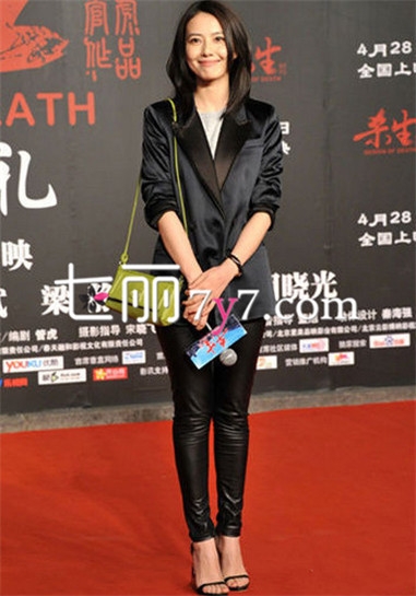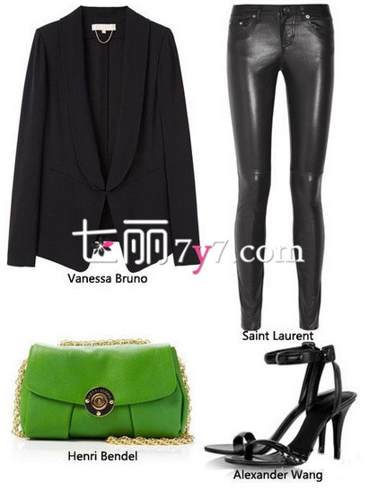 时尚点评:缎面西装外套十分有质感,紧身皮裤容易让大腿显得粗壮,但是中长款的西装弥补了缺陷。丝缎西装和紧身皮裤让她看上去高贵典雅,具有时尚达人的特有的气质魅力。一双凉鞋简单大方,一款草绿色单肩包点亮整体色调。