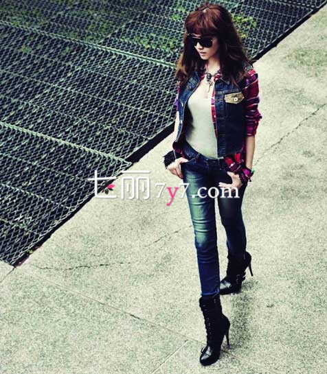 搭配要点:这组街拍图片展现出Jessica不一样的一面,抛掉以往甜美的形象,做个时尚的女强人。格纹衬衫外披牛仔马甲撞出不一样的效果,穿上牛仔紧身裤展现出纤细的双腿,高跟靴是必不可少的单品。