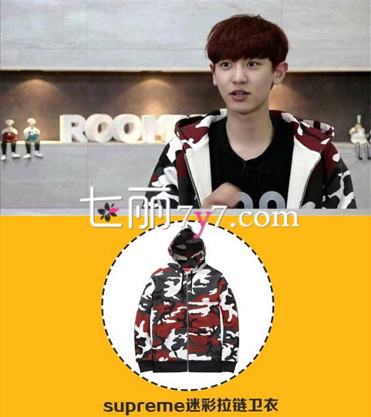 搭配要点:在节目中,灿烈因为行程忙,所以镜头较少。这件Supreme的拉链卫衣初秋穿上最合适,迷彩的图案展现出十足的男子气概,灿烈内搭黑色的T恤帅气十足,简单的搭配就能穿出不一样的Style。
