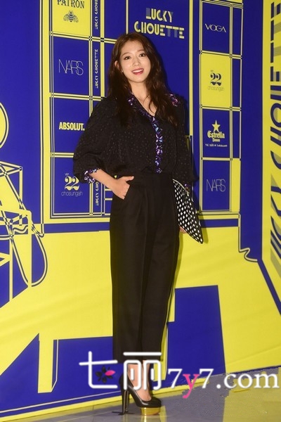 以黑色为主的搭配,朴信惠穿上也耀眼十足,紫色的印花衬衫V领的设计,展现出性感的锁骨,外披黑色的外套显得而成熟稳重,黑色的阔腿裤穿上容易显矮,搭配黑色的恨天高,气质的Feel都表现出来了。