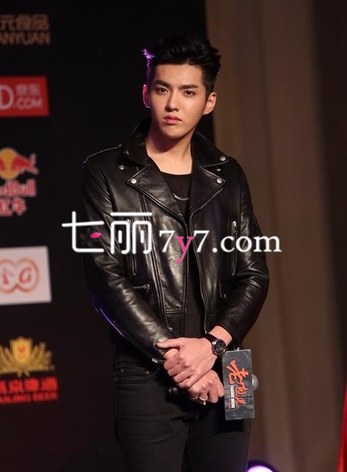 吴亦凡虽然同样身穿皮衣夹克,但完全是另一种风格。内搭简洁的黑色上衣,全黑的搭配看起来酷劲十足,搭配黑色的紧身裤,造型干练帅气,更加随性不羁,也更有青春朝气的潮男范儿。