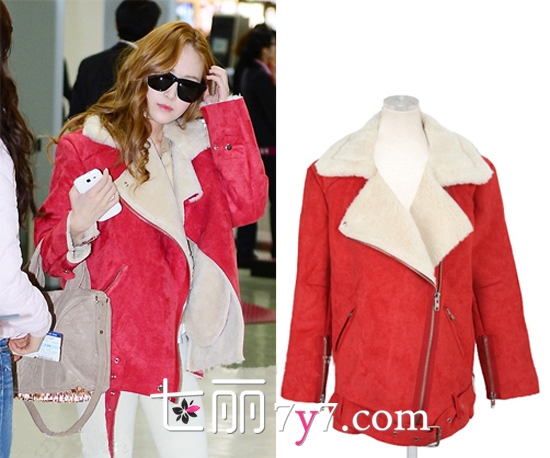 搭配看点:Jessica号称少女时代中时尚嗅觉最灵敏的成员,13年伊始,她大胆尝试了一款正红色的翻领机车外套,加上她新换的浅亚麻发色,惊艳了所有机场记者。Oversize的机车外套搭配米色系紧身裤和Alexander Wang经典款铆钉包包将Jessica率性干练的女性气质烘托地相当成功。
