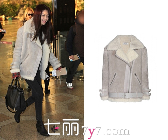 搭配看点:一件好衣服就是可以搭出很多不同的感觉。13年底,少女时代以模特身材著称的秀英也尝试这件翻领机车外套的米色款。与Jessica所展现出的女性气质不同的是,秀英利用这款外套搭出了中性帅气的味道。浅色的大外套下搭配的是格子衬衫,深灰牛仔裤和中性机车包。
