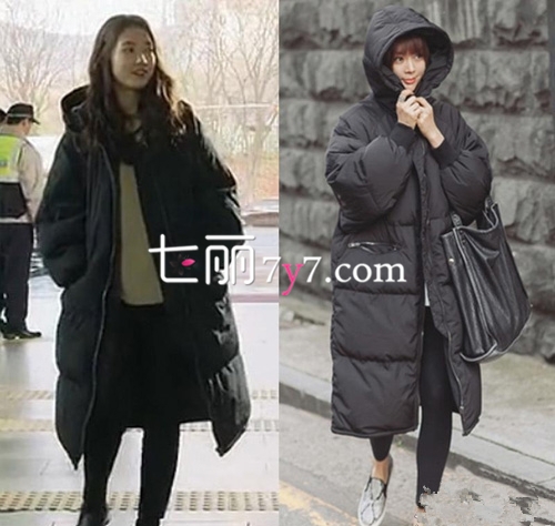 朴信惠身穿黑色连帽长款羽绒服,典型的韩版服饰设计风格,长款裁剪,可以遮盖住肚子和腿上的肉肉,穿在身上十分拉风,黑色的更加显瘦!内搭白色毛衣下穿黑色长裤,打造出完美的曲线,简单的搭配也韩范十足!