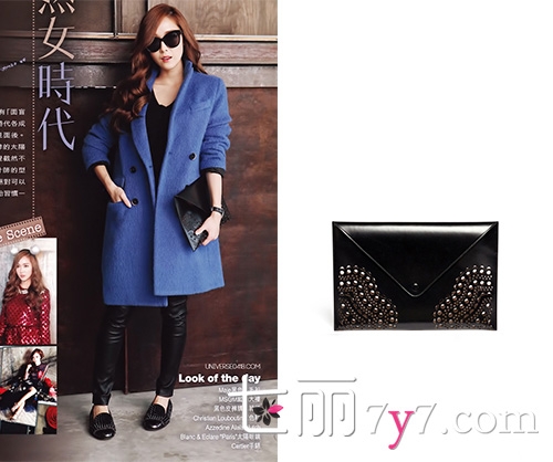 搭配要点:宝蓝色大衣+紧身牛仔裤+铆钉手拿包