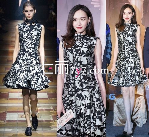 这件黑色印花无袖连衣裙搭配黑色尖头皮鞋,淑女范儿十足的裙装,上身有种典雅恬静的美感,唐嫣总算摆脱了一贯甜美风格,收腰的设计展现出纤细的腰身,这样才能拉长腿部曲线,加上红唇女人味十足!