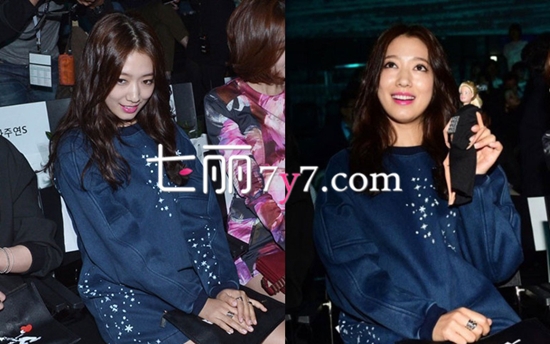 近日,2015春夏首尔时装周开幕,韩国本土设计师Jain Song品牌在DDP(首尔东大门设计广场)举行了一场2015S/S Collection 时装展,著名人气女星朴信惠穿衣搭配一件深蓝色星星卫衣搭配黑色手包、红色高跟鞋亮相,甜蜜笑容魅力迷人。