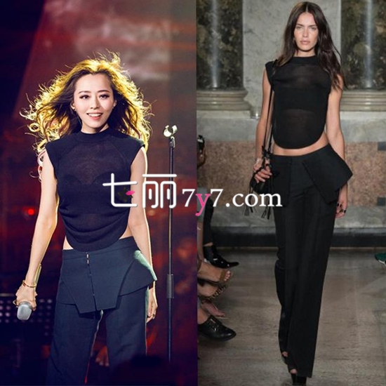 张靓颖身穿Ports 1961 2015春夏系列露腰黑色套装,在《我是歌手》的舞台上演唱《饿狼传说》,展现出野性的Feel,纤细的大长腿加上蓬松的卷发,让张靓颖的魅力难挡,若隐若现的小蛮腰更是性感十足。