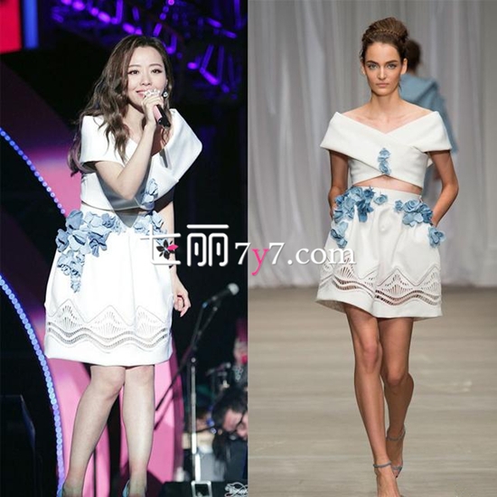 张靓颖身穿来自Ermanno Scervino 2015春夏系列的花朵裙装,洋溢着浪漫的少女气息,上面的立体花朵图案很有春天的气息,裙摆镂空的设计展现出性感的Feel,上衣采用交叉的款式,露出锁骨很有女人味哦!