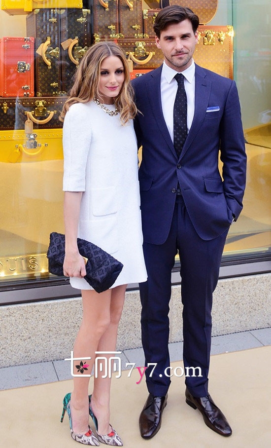 搭配看点:奥利维亚身着一袭纯白连衣裙,名媛风范尽显,搭配金属项链更显贵气,也为造型增加时尚感,手中的深紫蓝色包包与男友西装颜色相呼应,不亏是时尚圈最会穿衣的情侣之一,男友的一身紫蓝色西装,笔挺的身线着实让人垂涎,内搭白色衬衣与Olivia的裙装呼应,十分高大上又默契十足的搭配。