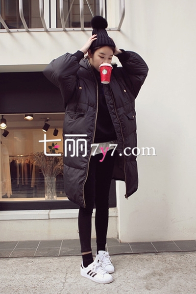 整套搭配以黑白为主,这样才不会出错,黑色长款羽绒服搭配黑色紧身裤,展现出姣好的身材,内搭白色衬衫和黑色针织衫有风度也有温度,下穿白色球鞋,戴上毛线帽,可爱休闲韩范儿装扮,轻松穿出完美身材,简单大方不失时尚感。