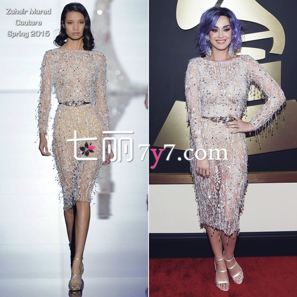 Katy Perry穿Zuhair Murad高定连身裙亮相第57届格莱美,这次水果姐正经的玩起了女神调调。一身钉珠流苏透视礼服裙,让她的性感指数直接爆棚,中间系上腰带,让她的腰线提升,展现出性感的身躯,紫色的染发起到画龙点睛的作用,这样才有水果姐的Feel。