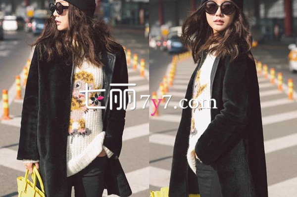 童趣毛衣破洞牛仔与简洁又不失设计感的黑色大衣的混搭尽展大长腿look,黑色针织帽与墨镜搭配简单随性,整套搭配以黑白为主,这样更加不会出错,破洞的牛仔裤酷劲十足,戴上圆形的墨镜很有Feel的造型。
