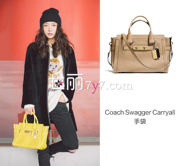 这次机场街拍造型,王珞丹大走轻奢路线,Coach卡通针织衫搭配破洞牛仔裤潮气十足,黑色皮草外套简单时髦又保暖,Coach Swagger Carryall黄色手袋是亮点,为整套造型加分,秀出王珞丹个性玩味的时尚型格。