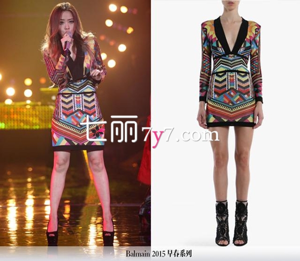 张靓颖自带性感舞团热辣登场,点燃全场激情,身穿的Balmain 早春系列连身裙也是异常的性感火辣。热带印花元素v领连衣裙,相较于模特大v领的设计,张靓颖这件裙装改良的非常保守,不过丝毫不影响美观,看起来依然清新动人。