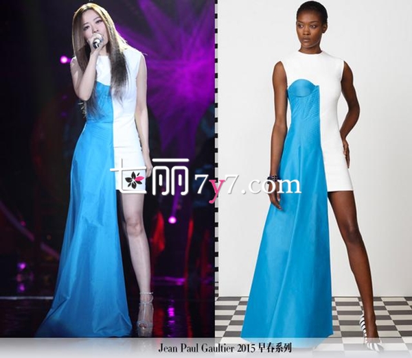 这条设计上充满巧思的Jean Paul Gaultier 2015早春系列的连身裙,助力张靓颖完美诠释朴树的经典曲目《生如夏花》。 蓝白相间的礼服裙,一边长一边短的裙摆设计,加上色调温柔清新,看起来美丽动人,选择这款裙子真的很赞哦。