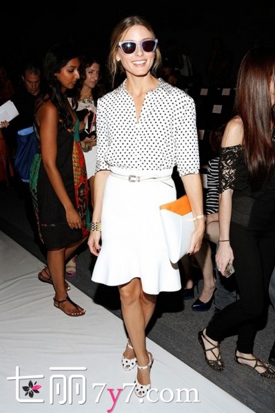 搭配看点:这套造型是小编在Olivia Palemo这套图片里第二喜欢的造型,身为波点控的小编,在看到这张图片的第一眼就被Olivia Palemo身上的波点衬衫所征服,黑色波点衬衫以内扎的方式配上高腰的纯白半身裙,使整个人看上去时尚且干练,橘黄和白色的撞色手包,使整体的颜色不那么单调,点睛的波点高跟鞋与衬衫相互辉映,更有大牌范儿。