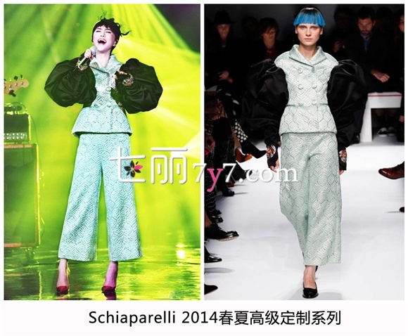 上周五《我是歌手》第三季第九期踢馆赛中,谭维维的造型饱受争议,但是这套黑色蓬蓬袖的绸缎套装其实大有来头,来自足以与Chanel分庭抗礼的老牌时装屋品牌Schiaparelli 2014春夏高级自定义系列,红色的Jimmy Choo高跟鞋与黑纱帽的点缀,又为这一身颇具民族风注入时尚活力。