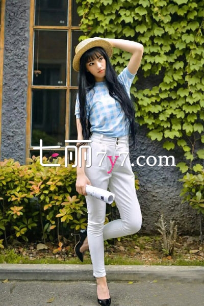 搭配看点:蓝白相间的格子上衣,很是清新怡人,经典不败的格子元素百搭又实用,下身穿白色小脚裤,高腰款式,拉长身材比例,带些复古味道又能秀大长腿!