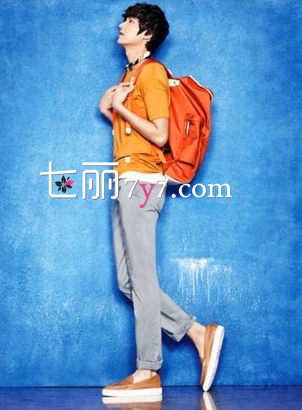 LOOK 4:橙色T 恤+灰色长裤+棕色乐福鞋+橙红色双肩背包