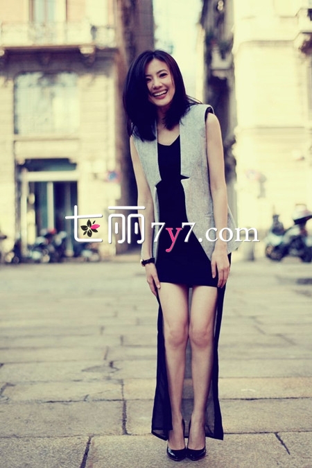 LOOK 7:西装马甲+前短后长连衣裙+黑色高跟鞋