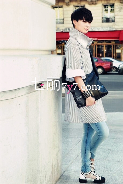 搭配看点:清新的条纹元素、个性的衣领和卷起的袖口时髦和酷感兼具,不过相信这样个性的衣领也只有李宇春可以hold住了。下装选择浅蓝色紧身水洗牛仔裤,让整个造型更加清新,非常有春天清爽的感觉。包包是Chanel新款,别致的设计是潮流之选,不过老佛爷这款独特设计是否能成为经典也只能让时间来检验了。黑白拼色的厚底鞋与上衣和包包色彩呼应,让整体造型更有旋律感。