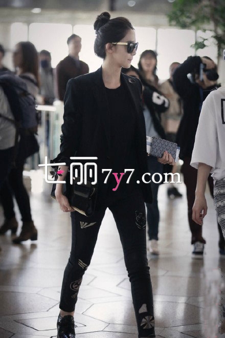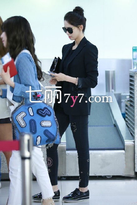 搭配看点:林允儿这次的机场搭配可以说是惊艳全场,看多了她甜美暖心的装扮,换上黑色小西装、T恤,配上黑色牛仔裤,将黑色进行到底,穿出不同于以往的霸气时尚,裤子上镂空花纹设计更潮,一个丸子头也不会影响整体造型感。
